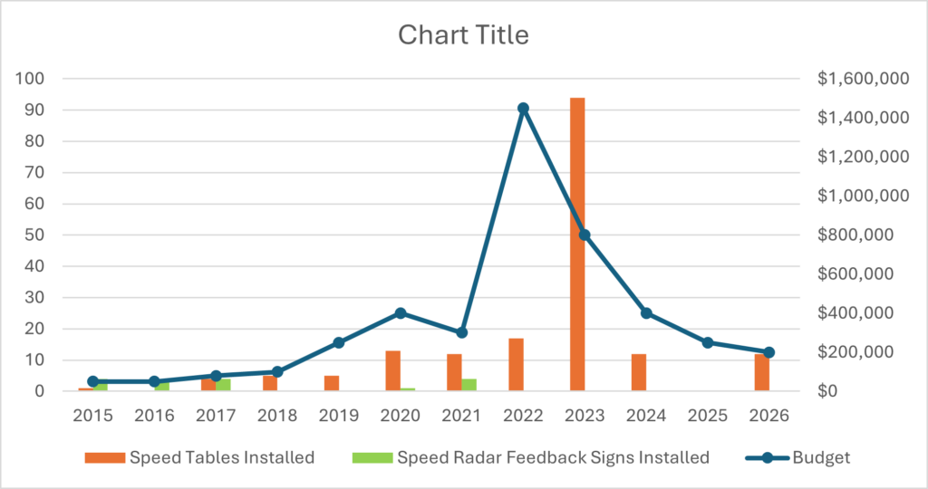 Graphic Description: A bar and line chart depicting the Traffic Calming Budget (as a line) and Installations (bars) by year. It shows a significant spike in speed tables installed in 2023. It also shows a significant increase in the budget in 2022 which immediately goes back down in the years after.