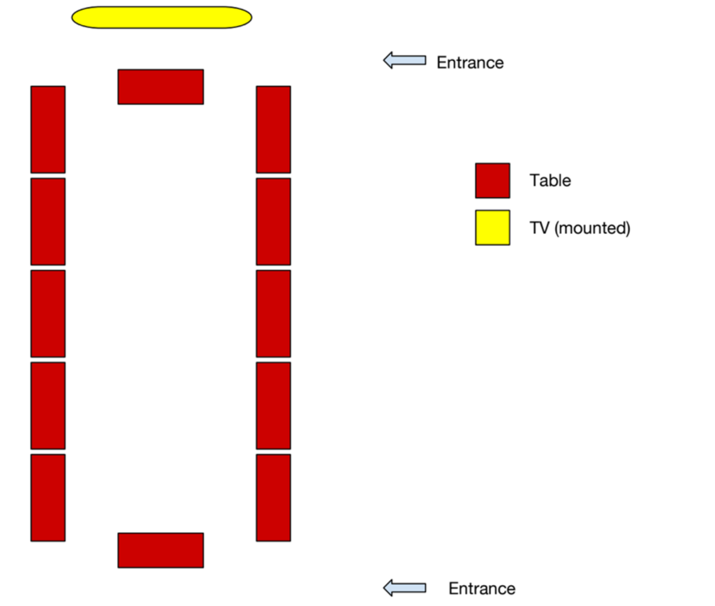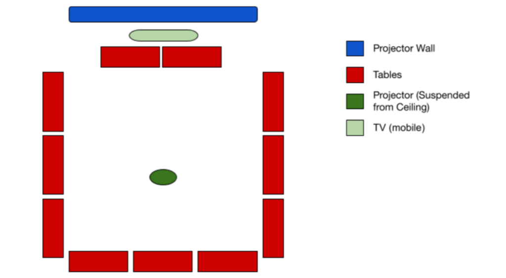 Each space has a default furniture arrangement, shown below. Users are responsible for rearranging furniture if a different setup is desired and must return it to the default configuration before departing.